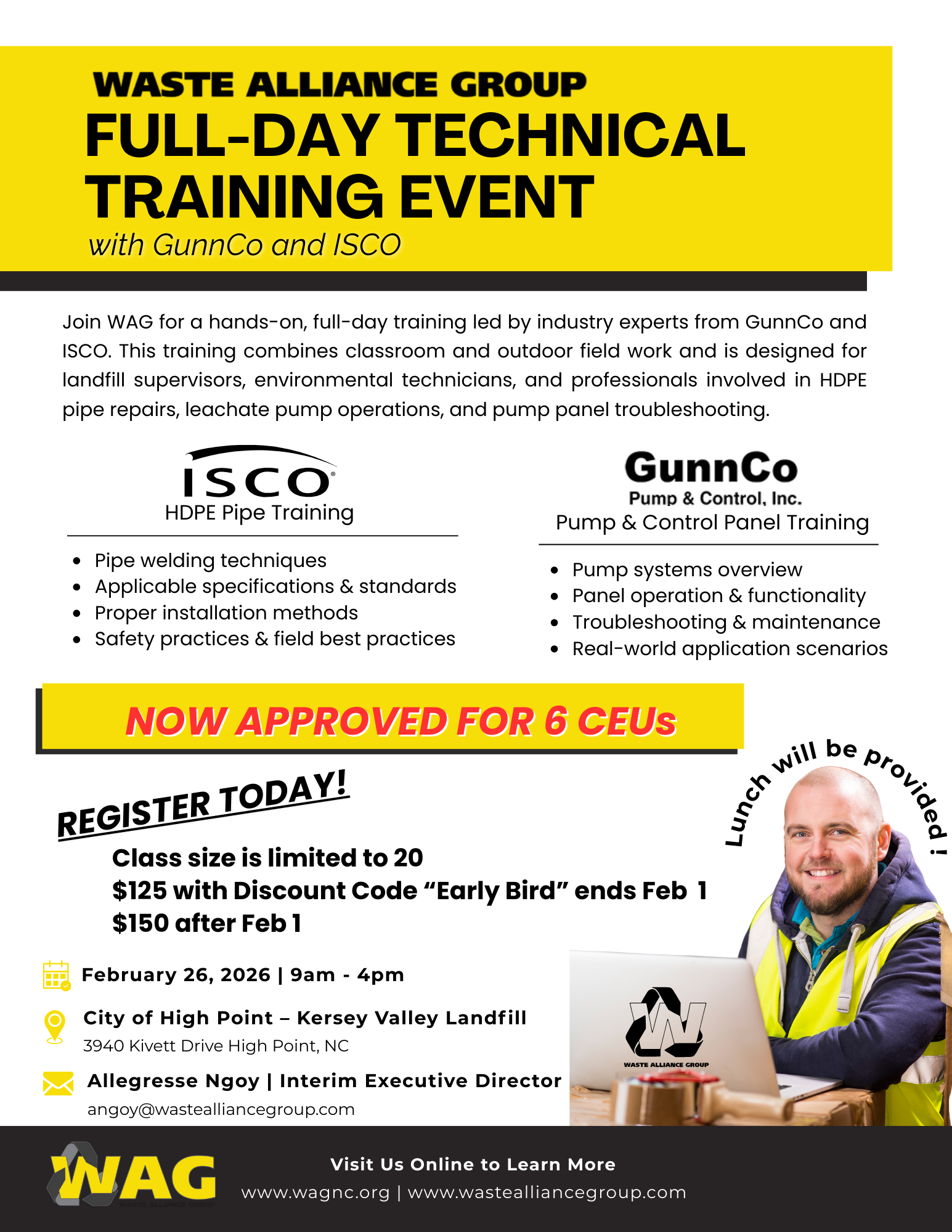 WAG invites you to a full-day, hands-on training led by experts from GunnCo and ISCO. Participants will take part in both classroom learning and outdoor field activities focused on real-world applications for landfill supervisors, environmental technicians, and those responsible for HDPE pipe repairs, leachate pump systems, and pump panel troubleshooting.